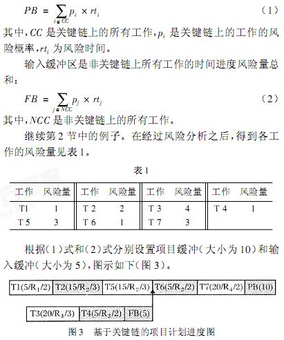 为了保护关键链上的工作而不影响到整个项目的计划进度,关键链技术要求为关键链设置项目缓冲区;同时为了防止非关键链上的工作影响到关键链上工作的进度,在非关键链与关键链的汇合处设置输入缓冲。Goldratt是以链上所有工作预测工作时间时节省下来的安全时间的50%作为缓冲区的大小。本文考虑以各项工作的风险量之和作为缓冲区的大小。