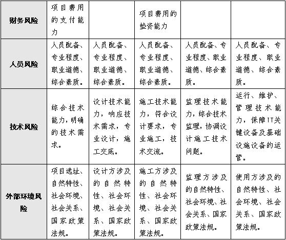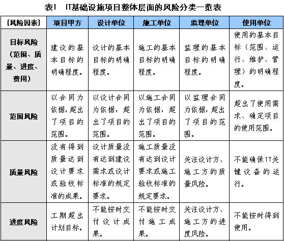 在标准的《项目管理》教材或书籍中,项目风险的分类通常是按政治风险、法律风险、自然风险、经济风险、社会风险等大类别分类的。在实际特定的IT基础设施项目中,涉及项目整体风险可以按照符合IT基础设施项目特点与特征的一些关键因素类别来进行项目的整体风险分类。可以是以项目各阶段过程中,项目涉及单位以及各方的职责分工和责任承担为主线来进行项目风险的梳理。见表1。