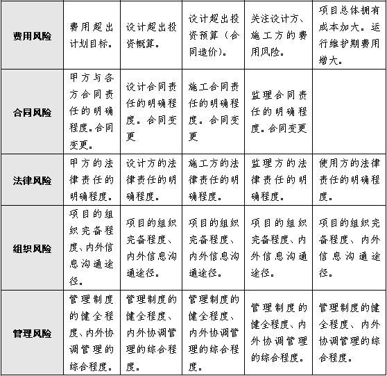 例如:合同风险中,若甲方要进行设计的合同变更,由于是与设计方的设计合同相对应的,由此会直接涉及到设计方的合同变更。又如:财务风险中,甲方的项目费用的支付能力是与施工方的项目费用的垫资能力相关联的,甲方支付得越多,施工方可垫资的越少。再如:质量风险中,施工方施工质量没有达到设计要求或施工验收标准的规定要求,则甲方没有得到质量达到设计要求或验收标准的成果,使用方不能确保IT关键设备的运行。这正表明了项目整体风险的一些特征。