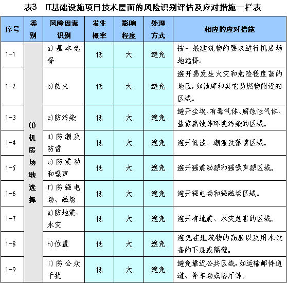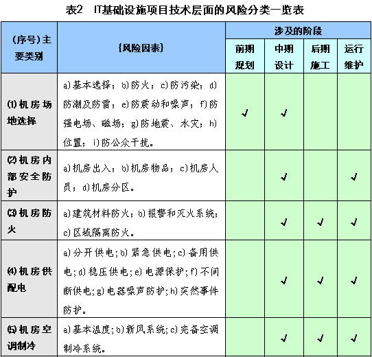专业技术系统是IT基础设施项目中,综合地反映了规范标准、系统结构、功能应用、产品特性、材料工艺以及管理要求等诸多方面的因素,也是IT基础设施项目具体建设要求的体现与实现。对于IT基础设施是为IT关键设备提供物理空间与环境的信息中心(数据中心)场地环境以及相关的基础设施系统这一“框定”。在信息中心(数据中心)中,从专业技术的层面对前期规划、中期设计、后期施工以及运行维护各个阶段来梳理容易产生“一种不确定的事件或状况”,这里更多地从技术细节的角度考虑IT基础设施项目的风险。见表2。