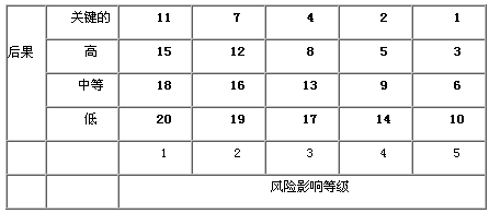 4、 对风险按照风险影响进行优先排序,优先级别高的风险,其风险严重程度等于1,优先级别低的风险,其风险严重程度等于20。对级别高的风险优先处理。