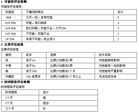 4、 风险类别(产品规模、商业影响、客户特性、过程定义、开发环境、技术难题、人员数目及经验)