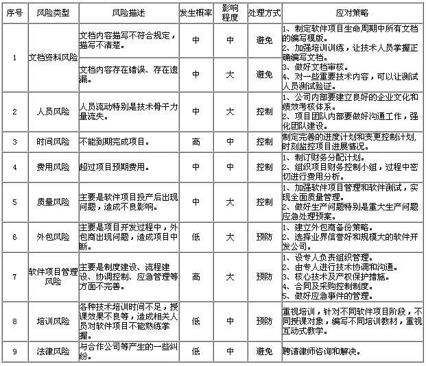 6、其他方面风险:主要包括文档资料风险、人员风险、培训风险、项目管理风险、外包风险及法律风险。