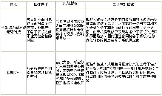 项目主要风险有两个:分别是子系统之间不能无缝衔接和延期交付,具体如下: