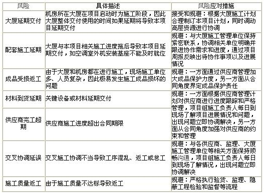 大厦延期交付:在项目启动之后,大厦由于特殊原因延期交付2个月,针对该风险的发生只能采取接受的措施,同时根据大厦新施工计划合理调整本项目计划,由于该风险发生导致的项目延期交付在可接受的时间范围内,因此没有启动应急计划;