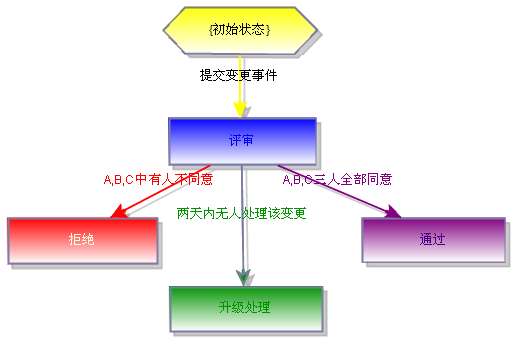 这工作流指明了,在一个变更事件被创建后,它需要经过一个《评审》状态。在评审阶段里,有三个人(A,B和C)要全部同意,才能到达《通过》状态。有任何一人不同意,状态转到《拒绝》。当一到达《评审》状态,系统马上促发邮件和手机通知,将信息寄给A,B和C。系统可以预先设定这三人有两天的时间评审该变更。假如两天过了,状态仍为《评审》,那是有人未及时处理该事件。这时候,系统会自动将事件升级,把状态转换为《升级处理》,系统马上促发邮件,将信息寄给研发部王总监。王总监可以斟酌情况,做妥善的处理。