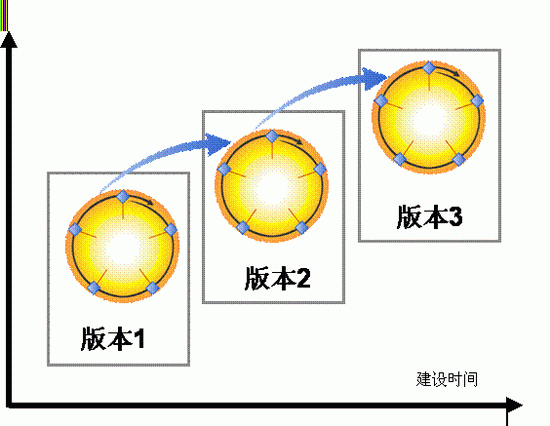 经过项目组多次讨论,后一致认为,对于大型信息化建设项目,务必把大项目化解为能够控制的不同阶段的小项目,这样能够有效地掌握每个小项目的实施难易度、经费以及时间,确保实施的成功。这里提到的小项目,指同一系统的不同功能。当基本的、主要的功能完成后,再扩展到其他高级功能。通过这一措施,能够有效的减小项目风险。下图是对版本驱动的一个图示,通过版本升级逐步完成系统功能,而不是一次性做一个大而全的功能: