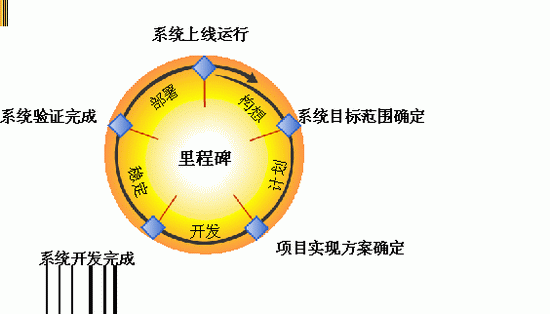 针对企业信息化建设,我们将其划分为系统目标范围确定、项目实现方案确定、系统开发完成、系统验证完成和系统上线运行五个里程碑。