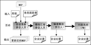 样例一显示了通过周会控制项目的流程。周会过程的目的是报告项目绩效和存在的问题,及时进行跨组、跨部门的协调和纠偏。
