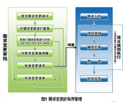 以下描述的是一个典型过程(如图1)。一项变更请求在需求管理系统中被提交后,与之关联的各个部门,如市场、项目管理、产品研发、QA、测试等,都会有相关人员接到系统通知而介入。他们将组成评估团队,根据实施难度、周期、费用、对其他机制的影响等指标,对该变更进行全面考察和评估。