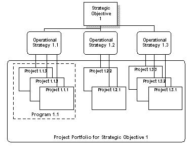 图一. 战略、项目、项目群以及项目组合的关系图 (Archibald 2003, 第13页).