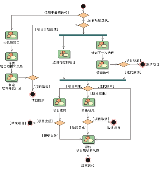 在完成软件开发计划的制定后,应当对项目的风险和可能的商业回报有足够的了解,以便作出明智的决定,为先启阶段的其余部分争取资金,或放弃该项目。在这里,项目管理工作流程将合并到所有后续迭代的公用流程。