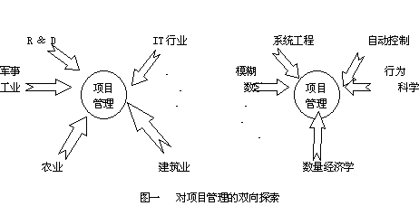 自50年代末,60年代初以来,学术界与各有关专业人士对项目管理的研究基本上在两个方向努力。一方面是各领域的专家们在探讨本学科在项目管理中有无用武之地,如何将本学科领域的专业理论、方法应用于项目管理。例如:计算机、控制论、模糊数学等等。另一方面则是各行各业的专家们在探讨如何把项目管理的理论、方法应用到本行业中去。如建筑业、农业、军事工业以及近几年呼声很高的IT行业等等(见图一)。