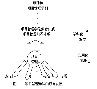 这种双向探索尽管均出自于外界的需求,但却极大地促进了项目管理自身的发展。使得项目管理也在向两个方向发展:一是向学科化方向发展。项目管理在吸收各学科的有用部分,逐渐形成一些自己独立的内容体系。例如:美国PMI于1986年提出的项目管理知识体系(PMBOK),国内外大学所建立的学士、硕士、博士学历教育体系、成人教育的课程体系等等。另一方面,为了适应各行业发展的需要,项目管理学科也正在向实用化方向发展,包括各种方法、工具、标准、法规等等。如1992年我国的GB/T 13400.1~13400.3-92,“网络计划技术”,国际标准化组织于1997年推出的ISO 10006“质量管理——项目管理质量指导”以及各种计算机应用软件系统等等。这种跨行业、跨专业、有理论、有实践的学科发展,进一步促进了项目管理专业学科——“项目学”的建立和发展。(图二)