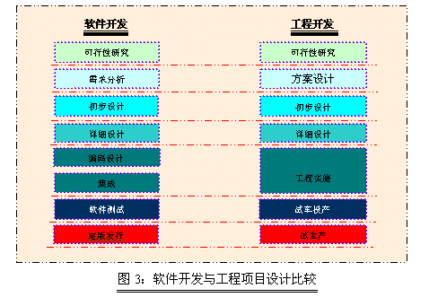 工程项目从可行性研究到后项目建成基本包括如下八个阶段。后二个阶段主要是考虑与软件开发比较而划分的,在实际的项目实施过程一般不将其作为独立阶段考虑。因此,一般的工程项目只包括六个阶段。(这里所指的工程项目可以是新建一间工厂,也可以是一个建筑工程项目)