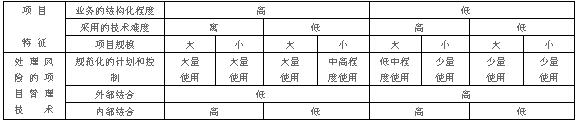 通常,任务的结构化程度越低,越需要外部与用户的高度结合。采用难度大的高技术项目通常借助于高度的内部项目结合和规范化很低的计划和控制。规范化高的计划和控制对技术难度低而规模大的项目为有用。项目风险的管理对策见表3。
