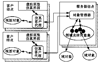 虚拟原型仿真在域对象的功能基础上进行.其模型在逻辑上是由多个域对象构成的网络,由一个服务器统一管理.参与虚拟原型仿真的用户通过客户结点连接到服务器上,如图2.服务器结点的核心是对象管理器,它通过对一组领域实体对象的管理,集中体现了产品的整体结构信息.客户结点由视图对象、仿真客户代理和协作虚拟原型仿真界面构成.视图对象由对象管理器根据用户的仿真需求动态产生,记录了用户希望得到的信息的内容和形式,其主要作用是配合仿真客户代理,为用户提供所需的产品仿真视图,以减少信息冗余.不同领域设计者关心的内容及认识问题的角度都有不同.仿真客户代理在各领域对象产生的仿真输出结果中查找用户需要的信息,经过一定转换后送到虚拟原型界面上产生可视化的输出.用户在界面上对虚拟原型所加的操作,被虚拟原型界面感知后,也通过仿真客户代理转化为域对象可识别的激励形式,并通过虚拟原型服务器发往各域对象。
