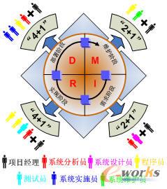 由于每个项目团队成员都有的各自的专业特长和性格特点,各项目成员的知识技能评估、个性特点分析、优点和缺点是要事先分析和考虑的内容,项目团队的组建是否合理,项目相关人员是否满足项目的需求,是项目能够顺利进行的关键,找错了人或者是将人放在错误的位置都可能会导致项目的失败。依据SDLC的划分,在每个阶段采取灵活的项目团队人员配置方案,如图1所示,对于需求分析阶段和系统维护阶段采用“1+2”的标准人员配置模式;对于软件实施阶段和系统部署阶段采用“1+4”的标准人员配置模式。根据企业规模的大小、人力成本以及团队成员的知识结构等因素,其中代表项目经理的“1”的职责会不断调整变化,适应企业和客户的要求;另外的“2”和“4”里面的成员则可以根据工作量的大小进行灵活的增减,既保证每个阶段的连续性,使开发过程顺利的过渡,又可以保证人员的充分合理利用,大限度的发挥出中小IT企业的优势。