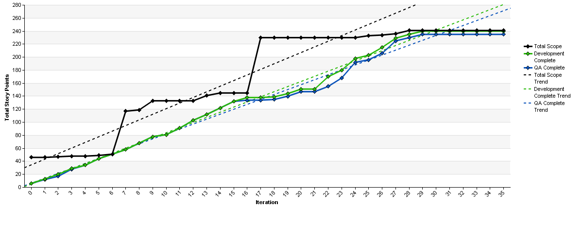 下面是全部35周的燃尽图,黑色实线代表项目的范围,绿色实线代表开发完成的速度,蓝色实线代表测试完成的速度,每周为一个迭代。