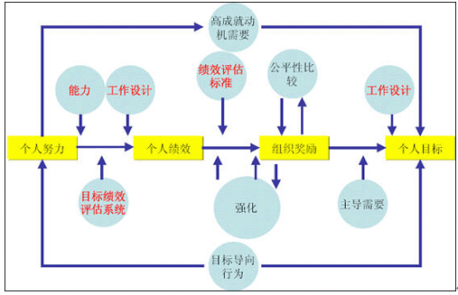 图中的中间部分显示了大部分研发人员动力产生的过程。研发人员个人工作能力提高、工作设计的改进以及目标牵引个人取得个人绩效。如果组织能够对绩效进行合理评估,会激励研发人员提高绩效,在这个环节组织奖励的公平性会影响个人员工绩效。如果组织奖励能够满足员工的主导需要,并帮助员工实现个人目标,会对员工产生积极的激励作用。