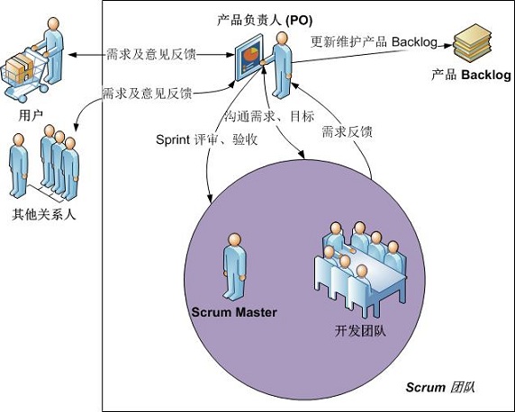 下面的图形反映了Scrum 团队中各个角色的基本关系: