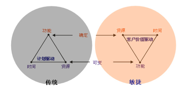 从这个角度来讲,我们需要把传统的项目管理三角形打翻。传统项目管理三角形里,通常来讲功能需求是确定的,然后根据功能去做分析,算出来所需要的时间和资源。而在敏捷开发里面,我们把这个给推翻,叫倒立三角形,像前面讲的烧水的例子,并不去做所有的事情,而是根据现有资源,有限的时间里有选择的去做一部分事情。
