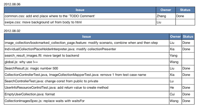 随着项目的进展,代码量的积累,代码质量的问题逐渐暴露了出来,这一阶段的session主要针对代码质量和软件设计,Home Ideas团队推出了“软件设计检讨会”系列session。起初,代码问题较多的团队成员检查自己的代码,并且和其他人一起讨论代码设计或重构方案,每周做一次到两次;并且把需要重构的问题专门记录在一个共享文档里,以便跟踪;不用太长时间,这些人的代码设计能力逐步成长到能够发现整个团队的代码设计问题,并且由主讲人变成了组织者,带动其他团队成员讨论代码问题。经过这一阶段,团队成员的软件设计能力和项目的代码质量都明显提高。