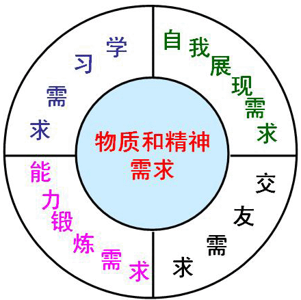 上图表达的基本含义是:任何一个团队成员,都存在“物质和精神需求”;而“学习”、“能力锻炼”、“交友”和“自我展现”这四个需求则因人而异,并非每个团队成员都具有,他们可能具有其中的一个或多个甚至不具有任何一个。