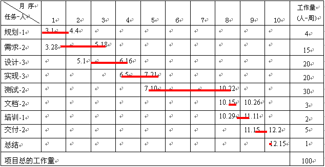 让我们用一个例子来说明这种方法是如何控制进度的。一般在作项目计划时都应该绘制计划图(如GANTT图,可用MS PROJECT绘),图1是项目EXP(本文用的案例)的GANTT图。图中还包含了人力的安排,在表示每项任务工期的杠的两端标出了该项任务的开工和完工日期。绘制这种图的难度在于对整个项目工作量的估计和对各项任务工作量的分配,关于这方面的问题,在不少资料上有介绍,本文不予讨论。从图1可以看出,这是一个需要100人-周工作量,分成9项任务的项目。开发工期为9个半月。下面我们讨论积分法的工作步骤。