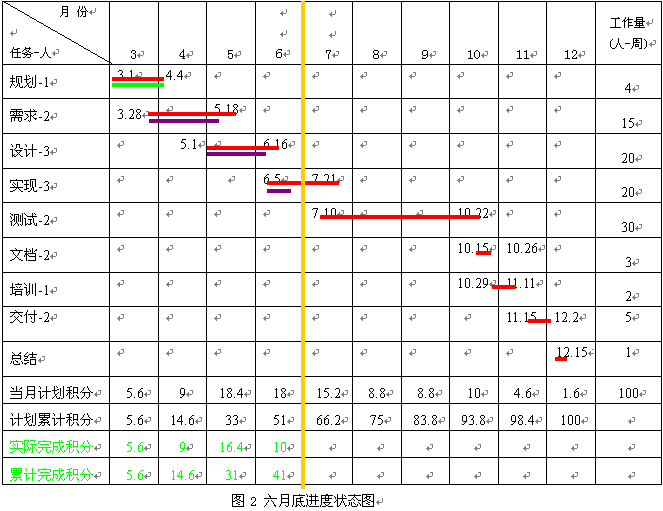 图和进度状态图上,时间粒度一般可用“天”,对大多数有一定规模的项目来说,应用WBS技术将任务分解到用“天”作时间单位来描述活动的工作内容,可以说做到“可控制”的程度了,如果还不能控制,则将活动再进行分解,直到可控制为止。我们将项目EXP中的设计任务分解成9项活动,同时,将它的计划图和6月底的进度状态图画在同一张图上,如图4所示。