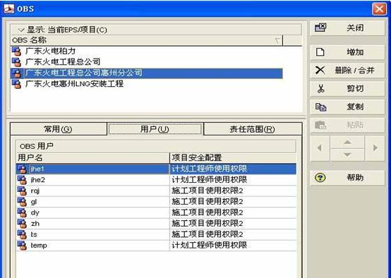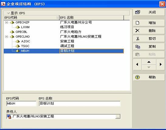 工程信息代码编制是非常重要的。工程信息代码是 P3e/c 项目管理软件基础的信息数据,必须按照已制定好代码编制原则及规范进行编制。我们已按总公司制定的《广东火电 P3e/c 软件应用代码规划》编制了企业项目结构代码(EPS)、项目组织机构代码(OBS)、作业分解结构代码(WBS)、工程资源代码以及各种作业分类码。部分结构如下: