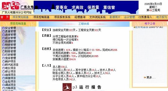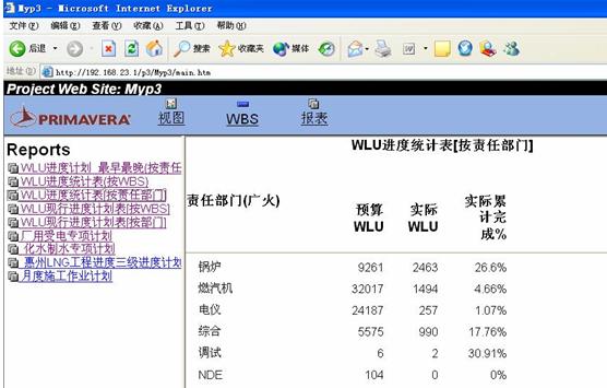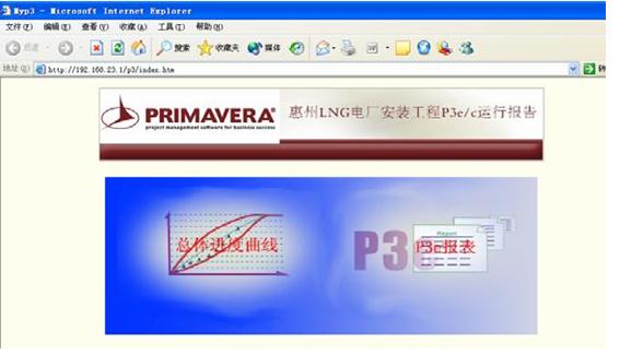 为了能及时反映工程施工动态数据信息,使得未安装 P3e/c 项目管理软件的管理人员也能进行工程进度计划的查询与分析,可以通过 P3e/c 项目管理软件所提供的项目信息发布工具生成施工网站。所发布的施工网站不仅可以作为独立的网站供用户访问,而且也可以与公司的信息网站链接起来,形成项目进度信息在公司内共享。在惠州 LNG 电厂安装工程中,我们很好地利用了 P3e/c 项目管理软件这个功能,把我们在 P3e/c 生成的各种报表数据如进度周报表、进度计划曲线对比表、月度施工作业计划横道图及各种视图等发布成 P3e/c 运行报告网站,然后通过公司内部网站链接,能及时在公司网上发布新的施工进度数据信息,实现及时、高效的进度信息共享。部分视图如下: