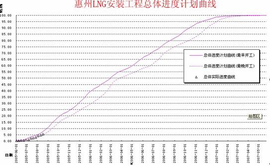 P3e/c 项目管理软件对于项目管理的应用效果,我本人认为主要的是看我们在工程项目管理过程中应用 P3e/c 项目管理软件的目的是否达到了,也是通过它的应用,我们对于大型工程的项目管理水平及工作效率是否提高了,通过P3e/c 所生成的各种报表数据是否能为我们的项目管理决策者提供决策数据,从而能够分析原因,找出偏差,确保项目进度能够按目标去实现。从惠州 LNG 电厂安装工程引进 P3e/c 项目管理软件进行项目管理的应用效果来看,已达到了我们的目的。主要体现在以下三点:第一,通过 P3e/c 项目管理软件在惠州 LNG 电厂安装工程应用后,我们的工程项目进度都处于受控状态,都朝着我们的目标计划去实现,以下进度计划曲线对比表能得到很好的证明。