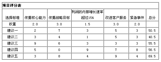 表A所示是一个项目选择表。譬如说,可以看出“建议一”非常符合机构的战略目标的标准,因为优先权分级小组给了它一个7分。然而,“建议一”并不太符合核心能力的标准,因此优先权分级小组只给了它2分。在这个模式中后一步是依据每个标准的重要性,按管理人员规定的低为1高为3的一系列数值做加权。例如,“改善客户服务”一项的权重是3,而紧急事件一项是2。注意,紧急事件跟上面讨论过的“必须”要做的一类事情是不一样。尽管建议四似乎比较紧急,它并没有被归入“必须”要做的项目中。这是为什么它要跟其它的一些建议一起进行分析的原因。很少会出现那种两个项目获得相同分数的状况;优先权分级小组可以挑出那些对整体资源要求不高的项目。