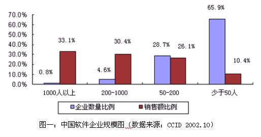 中国软件企业规模结构与传统制造企业相比不甚合理,“作坊式”软件企业比重偏高。据CCID(赛迪数据)2002年10月份的统计数据,目前国内软件企业中1000人以上的大型企业数量只占全行业0.8%,而50人以下的企业竟占到全行业的65.9%,软件销售收入只占全行业的10.4%(如图一所示)。这也是软件企业本身发展的一个特点,企业规模小,组织结构扁平化,管理灵活,反应快速,转型容易,高效输出。对处于发展期、成长期的软件企业没有必要制定非常详尽的各种规章、制度,而是必须考虑企业发展的实际状况和法律规定的要求,制定尽量少的、简化的但实用的制度,对企业的基本规范和业务重点予以规定,但随着企业的发展和伴随而来的管理难度增加,自然要求企业增添和修改相应的管理制度。因为知识管理属于企业发展战略层面的管理方法,所以软件企业可以很好地贯彻领导层的战略意识,具有实施知识管理的战略基础。软件企业具有求新和共享的企业文化,在以技术和服务快速变化为特征的商业中,创新往往是保持长久竞争优势的主要源泉,所以创新也是软件企业生存的必要条件,知识管理的目的是使企业的知识资源在有效管理后,能达到知识的创新。在软件企业交错的软件项目中,只有员工团结协作,共享知识,才能按时的完成项目,大量隐性知识的共享,是软件企业的大特点。