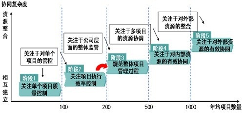 据AMT咨询公司的总结分析,从企业项目的协同复杂度以及项目数量来分析,项目管理会经历5个阶段:
