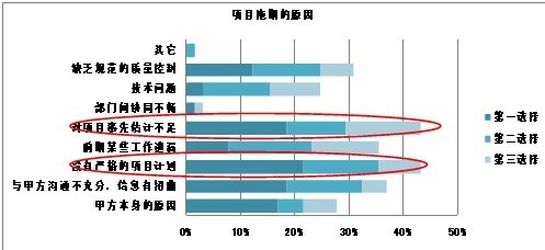 调查显示,分别有43%的员工选择对项目事先估计不足和没有严格的执行计划是造成项目拖期的首要原因。而这一现象在中小软件企业内是有代表性的。