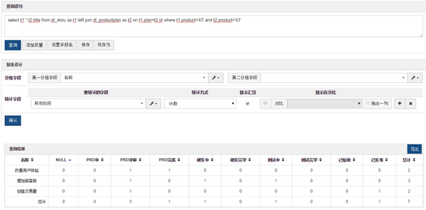 select t2.title, sum(t1.stage='wait') as PRD中, sum(t1.stage='planned') as PRD评审, sum(t1.stage='projected') as PRD完成, sum(t1.stage='developing') as 研发中, sum(t1.stage='developed') as 研发完毕,sum(t1.stage='testing') as 测试中, sum(t1.stage='tested') as 测试完毕, sum(t1.stage='verified') as 已验收, sum(t1.stage='released') as 已发布, count(t2.title) as 总计 from zt_story as t1, zt_productplan as t2 where t1.plan=t2.id and t1.product='43' and t2.product='43' group by t2.title