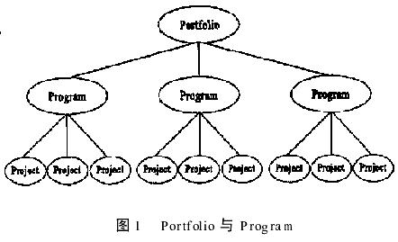 项目公司为了整体的利益,把一组项目用不同的方法组合在一起,这些项目具有共同的战略目标,共同分享组合内的资源。项目组合管理的大特点是管理多种类型的项目。项目进行的先后次序来讲,项目管理可以分为“项目链”管理、“项目网”管理和“项目组合”管理。“项目链”管理是依据特定要素进行的纵向管理,它是把一系列项目通过特定的标准联系起来的,如应用的技术,发生的地点等。“项目网”管理是横向管理,它是把项目公司在一个时点上正在进行的所有项目通盘考虑。“项目组合”管理是一种综合的管理形式,它是把不同类型的项目组合在一起考虑,如正在进行的项目和将要进行的项目,内部项目和外部项目,一次性项目和反复性项目,市场开拓型项目和紧缩型项目等都有可能包含在一起。另外,有的管理人员还把项目组合看作是具有共同目标的若干个Program的集合。这些Program组合在一起共同形成组织的目标。管理整个项目的组合与管理这些Pro gram有许多相同的特征,这个组合不过是更大一点的项目组合,如图1所示。