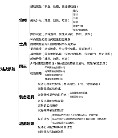 对战系统解构的模块有:将领、士兵、国王、装备、城池。每个模块纵向拆分成:基础(基准/差距)、提升(方法/难度/支出等)、操作方法等。