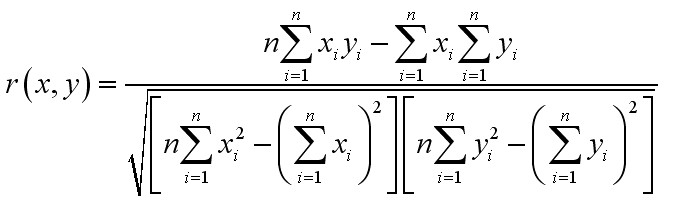 这里所谓的“合适”,在数学上的意义是和开发时间y的相关性强。那么什么是相关性呢,从直观意义上,两个变量的相关性是指两个变量关联的紧密程度,数学上可以用相关系数表示。相关系数计算公式如下: