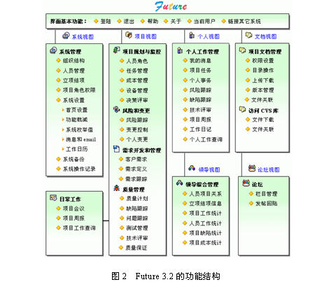 Future是和SPP方法论配套的集成化项目管理系统,主要功能有:组织结构和人员管理、立项与结项、项目规划与监控、需求开发与管理、风险跟踪和变更管理、质量管理、配置管理、日常工作管理、领导综合管理、论坛等。Future的功能结构如图2所示。