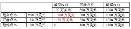 对于组织为当前项目付出的成本和得到的收益,我们会有一个估算。该工具会告诉大家:这个估算的不确定性程度如何。在项目早期,成本会有一个不确定性圆锥【原注5】,随着项目推进,该圆锥的顶角会越变越窄。收益的不确定性也很大。只要估算范围正确,在成本和收益方面的不确定性算不上大问题。成本和收益都应该展示出三个水平:乐观情况、可能发生情况、悲观情况。例如:
