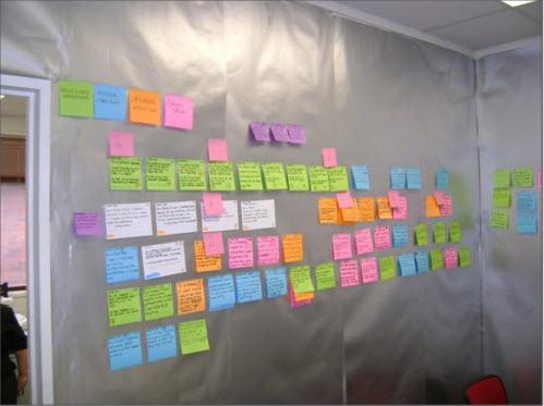 该路线图位于团队环境的过道中,起到信息辐射器作用,让所有工作在同一个项目组的团队们都能看到,其他任何对项目感兴趣的人也可以参考。产品路线图为从事同一个版本发布的各个团队们提供上下文。
