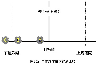 再则,在“怎样度量”上,6西格玛管理提供了“追求卓越”的度量方法。传统上,我们的度量于“符合性”上。举例来说,我们对照规范检查产品质量,我们把符合规范的记为合格品。对合格品来说,一般我们不再关心其符合顾客要求的程度。例如,某工序生产了A、B、C三个零件,A的测量值接近顾客要求的目标值,而B接近于规范下限,C则超过了规范下限(如图1-2所示)。我们把控制与改进的注意力集中在C上。尽管A产品的质量接近理想状态,而B产品几乎超差,但在传统的度量方法下,它们的质量表现是一样的,都视为合格品。但正是这种度量方法忽略掉的差异,在竞争力方面带来了不可忽略的差异。6西格玛管理重视符合顾客要求程度方面的差异,并通过采用揭示这些差异的度量方法,展示业绩改进的空间。
