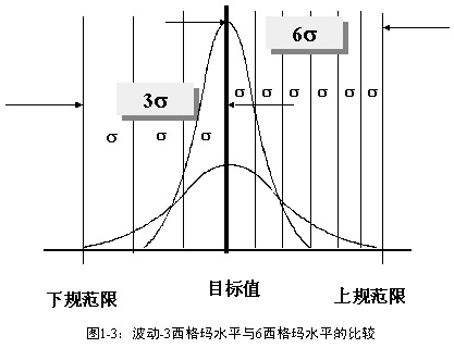 达到6西格玛水平是指Z等于6。如果用我们熟悉的正态分布来解释的话,也是说过程的波动非常小,集中在目标值附近。它们满足顾客要求的能力很强。而3西格玛水平则波动较大,其满足顾客要求的能力远不如6西格玛水平。(如图1-3所示)