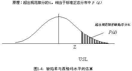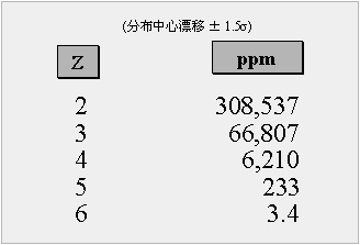 Z还有另一种表达形式:用百万分之缺陷率(ppm)来表示。一个服从正态分布的过程,其超出规范限的缺陷百分比与西格玛水平是一一对应的(如图1-4所示)。根据这个规律,我们可以通过测量缺陷的比率,估算过程的西格玛水平Z,并以此考察过程满足顾客要求的能力。通常,6西格玛水平所代表的过程缺陷率为3.4ppm,而3西格玛水平的缺陷率为66807ppm。