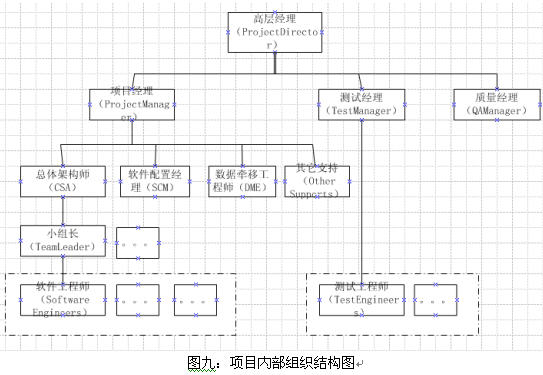 那么,从项目实际运作的角度来考虑,项目组织更多指项目实施方的组织,在项目实施方组织结构必需包含项目组内部的管理层次和工作的汇报关系等信息,即我们通常所说的项目内部组织结构图。如下图所示: