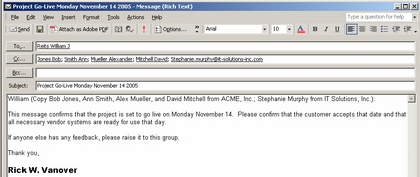 项目管理应保证清晰的通信。电子邮件似乎是的通信方法,但它很容易变得数目庞大,让人吃不消,从而使效率低下。一个普遍的良好做法是在需要响应时确定特定的个人。适当的使用致:与抄送:域,可以避免谁该如何做这样的不明确信息。图A显示的是一个列举特殊责任的电子邮件通信实例。