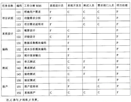 (5)工作责任分配矩阵。其作用是对项目团队成员进行分工,明确其角色与职责。通过这样的关系矩阵,直观地反映和明确项目团队中每个成员的职责,使项目的每个具体任务都能落实到参与项目的团队成员身上,确保项目研发过程中事事有人做,人人有事干(见表2)。工作责任分配矩阵可以详细列出每一项工作具体负责人完成的时间、工作参与的内容。